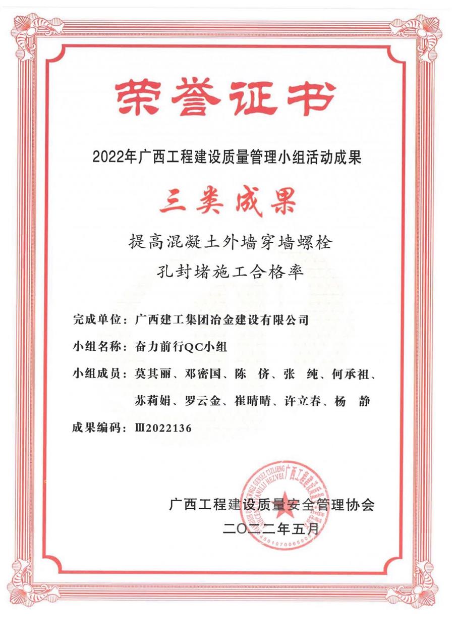《提高預(yù)制混凝土箱涵頂進(jìn)軸線(xiàn)偏差合格率》《提高混凝土外墻穿墻螺栓孔封堵施工合格率》榮獲2022年廣西工程建設(shè)質(zhì)量管理小組活動(dòng)成果三類(lèi)成果。