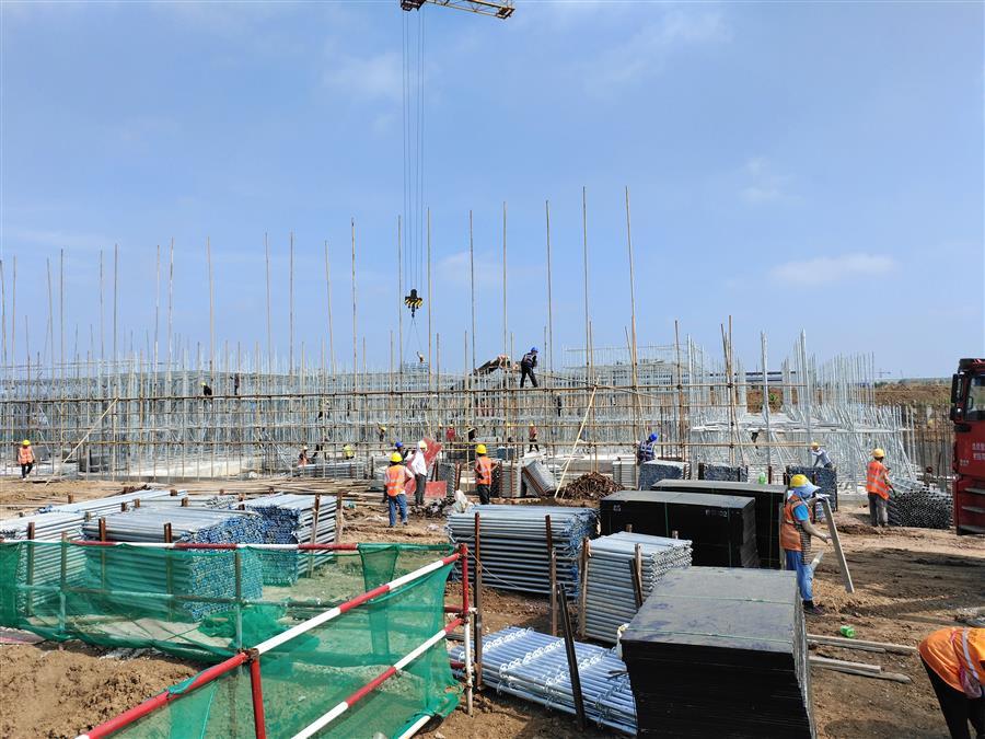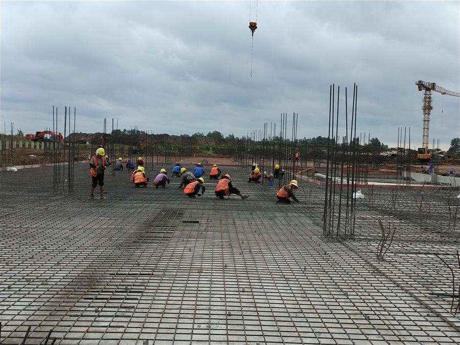 “日均投入施工技術(shù)人員500余人、各類機(jī)械設(shè)備45臺(tái)搶抓施工節(jié)點(diǎn)?!表?xiàng)目負(fù)責(zé)人禤旭云說,自6月開工以來,針對(duì)項(xiàng)目工期緊、任務(wù)重的情況,項(xiàng)目部按照“開工即攻堅(jiān)、起步即沖刺”的要求,全面推進(jìn)項(xiàng)目建設(shè)。目前,中試車間基礎(chǔ)回填、褥墊層鋪筑、墊層澆筑、剛性地面鋼筋綁扎完成;1#生產(chǎn)車間53~56軸獨(dú)基開挖基礎(chǔ)承臺(tái)鋼筋綁扎、模板安裝、砼澆筑完成,48~52軸基礎(chǔ)開挖、墊層澆筑完成;2#生產(chǎn)車間18~25軸基礎(chǔ)承臺(tái)鋼筋綁扎、模板安裝、砼澆筑完成;倉庫基礎(chǔ)梁全部完成。