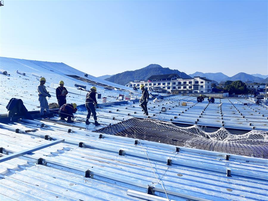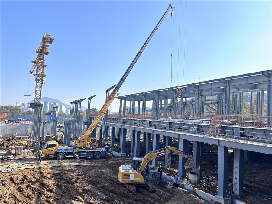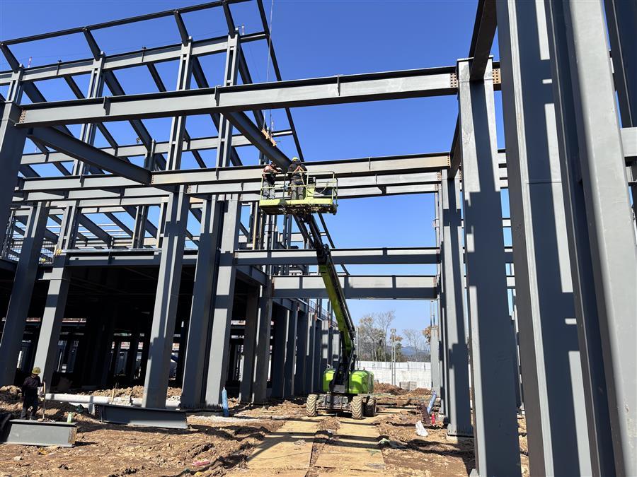 項目施工現(xiàn)場,機器轟鳴,工程車輛來回穿梭,工人們在各點位開展墊層、樓承板澆筑、鋼筋綁扎、栓釘焊接、基礎砌磚、屋面底板和鋼結構梁柱安裝等施工作業(yè),處處涌現(xiàn)“冬忙”景象。