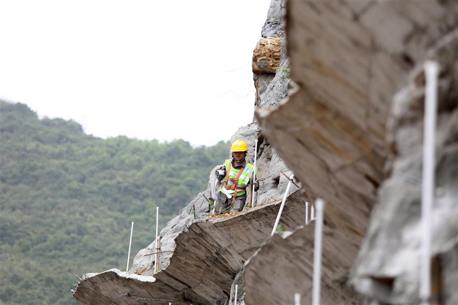 3月22日,一名工人在安全帶和安全繩的保護下施工作業(yè)。