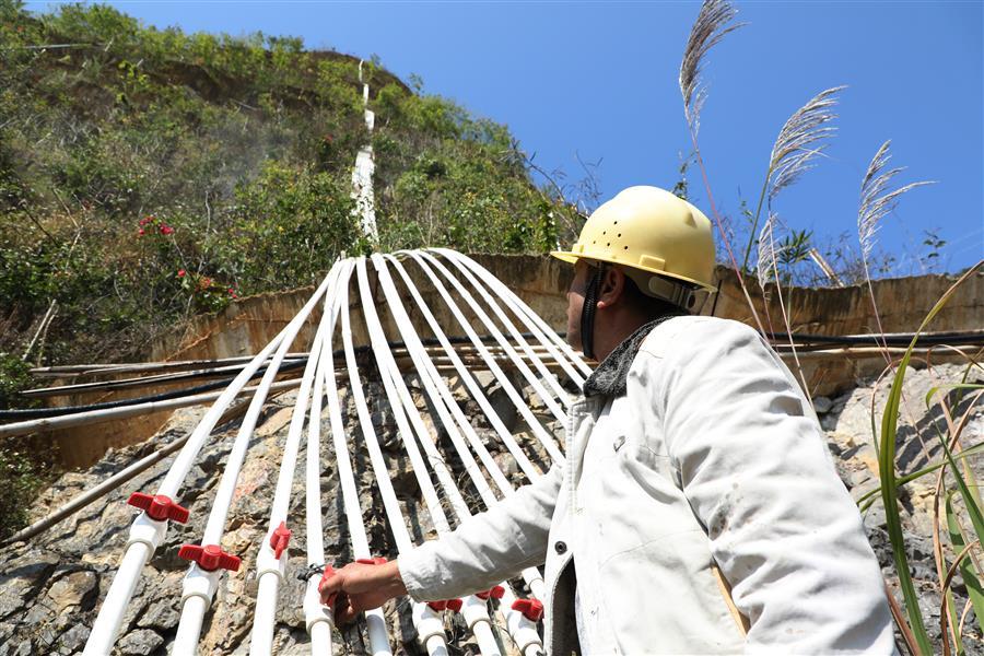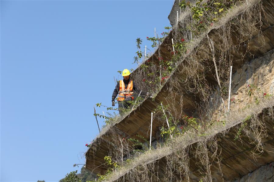 12月19日,工人在樓梯山的峭壁上養(yǎng)護綠植。