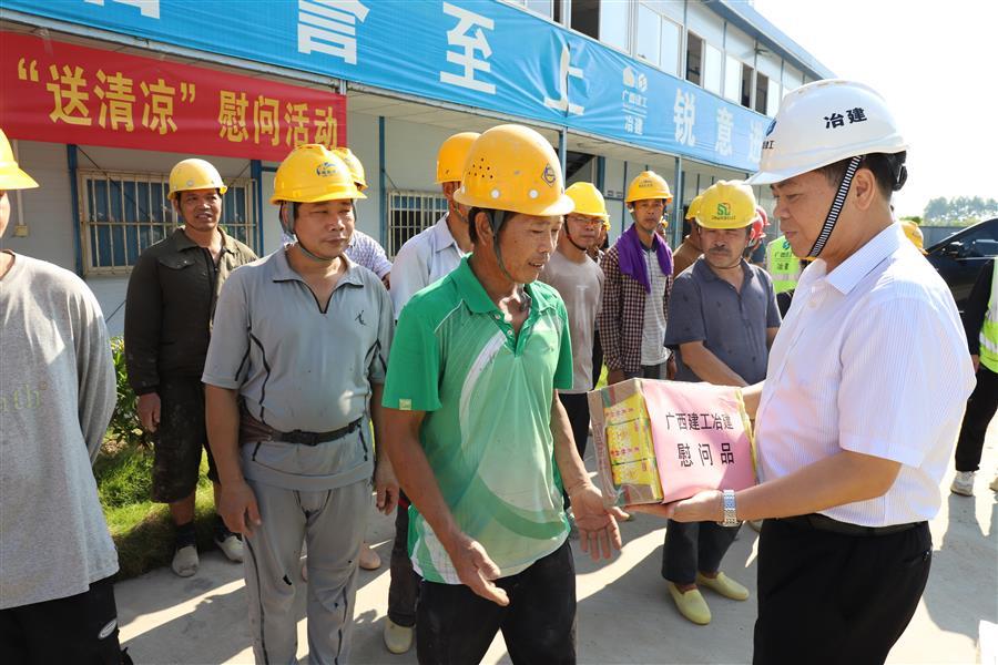 在柳州市柳東新區(qū)明德小學項目,蒙勝益親切問候了奮戰(zhàn)在項目一線的工人,對大家的辛勤付出表示感謝,并為他們發(fā)放了清涼飲品,同時叮囑施工人員在高溫環(huán)境下工作一定要合理調配時間,增強安全意識和自我保護意識,項目部要加強現(xiàn)場安全防護措施,確保生產(chǎn)、安全兩不誤,營造安全健康工作生活環(huán)境,為高標準完成各項施工生產(chǎn)任務保駕護航。慰問結束后,蒙勝益在項目召開座談會,協(xié)調解決項目建設過程中遇到的苦難和問題。