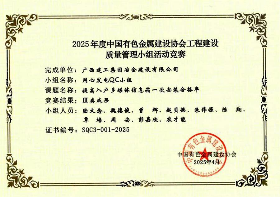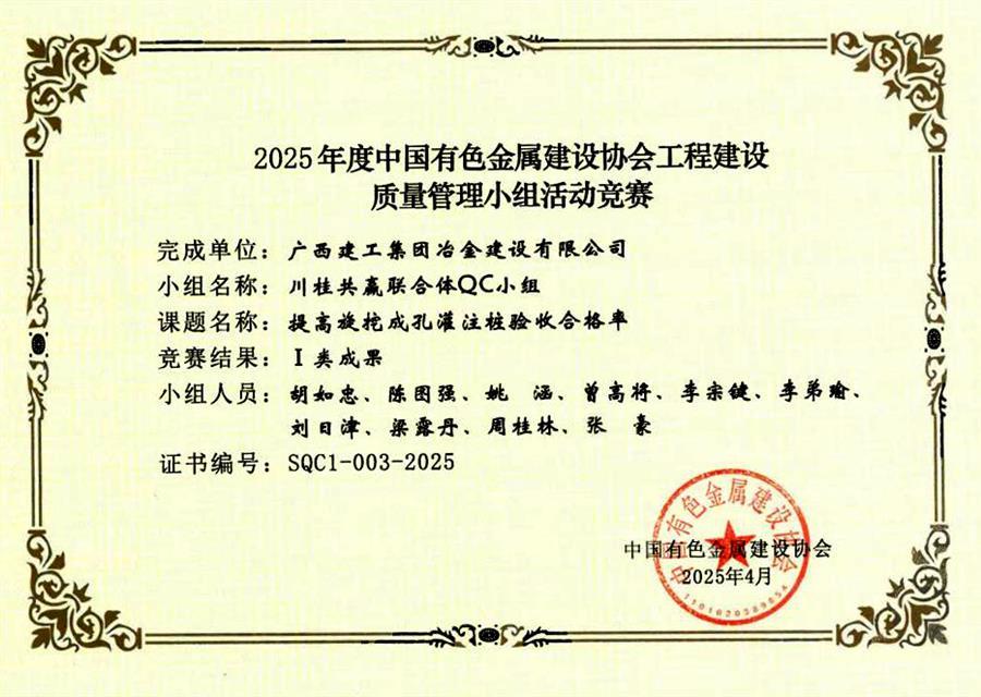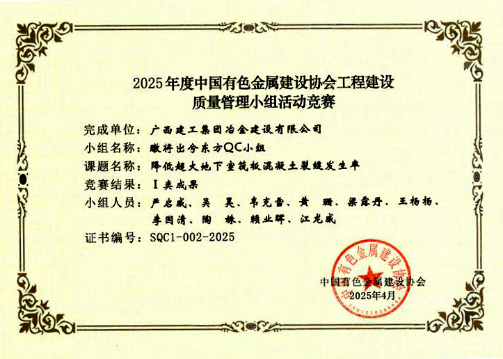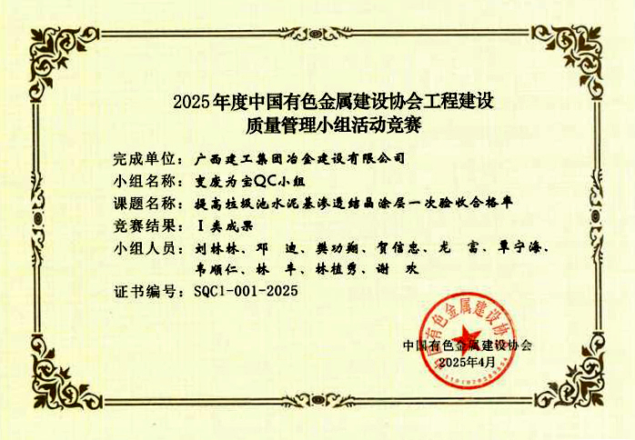 近日,中國有色金屬建設協(xié)會公布2025年度中國有色金屬協(xié)會工程建設質量管理小組活動競賽結果,冶建公司申報的4項成果中,有三項獲得Ⅰ類成果,一項獲得Ⅲ類成果。公司此次申報獲獎率100%。